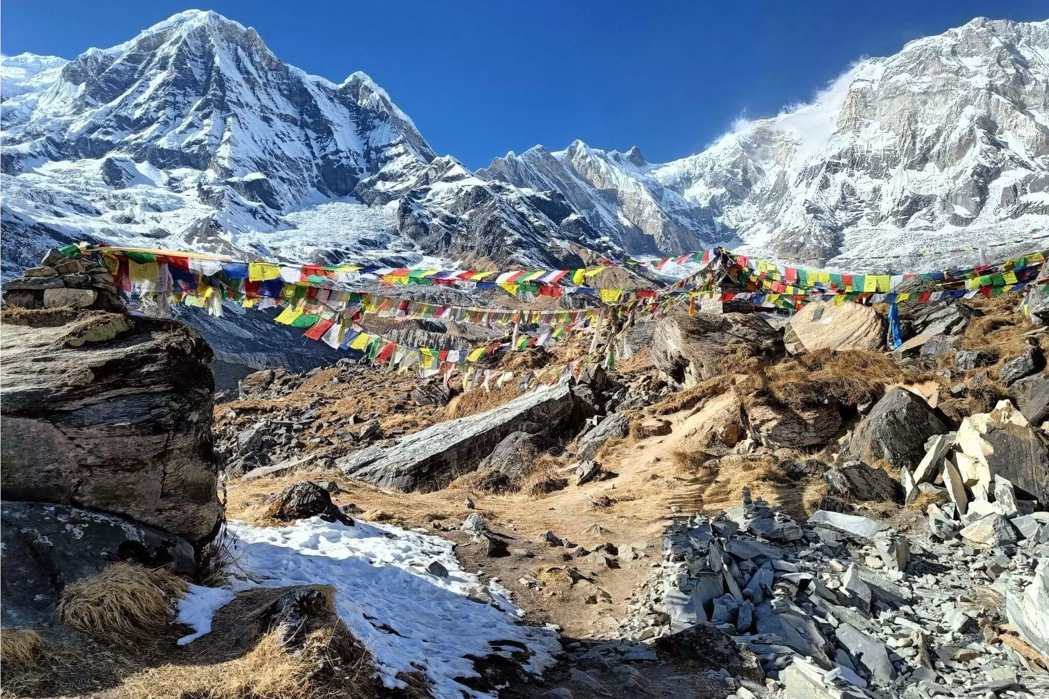 The Annapurna Base Camp Trek culminates at Annapurna Base Camp (4,130 meters), surrounded by towering peaks such as Annapurna I (8,091 meters), Annapurna South, and Machhapuchhre. Trekkers are rewarded with breathtaking sunrise views over the snow-clad mountains, creating a mesmerizing Himalayan panorama. After descending from Annapurna Base Camp, the trek retraces its steps back to Nayapul or Phedi, followed by a drive back to Pokhara.