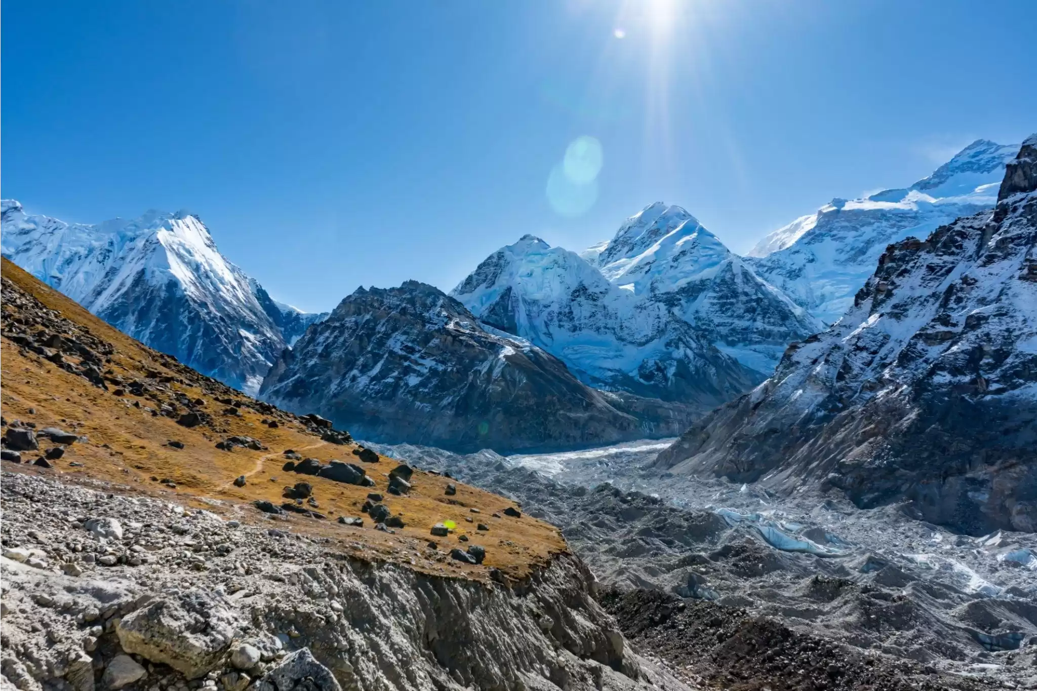 The Kanchenjunga Base Camp lies on the edge of the glacier, and surrounded by Tibetan prayer flags that offers majestic view. The route to basecamp offers many ranges in landscapes from alpine grasslands to sub-tropical forests, low river valley, glacial moraine, and rocky scree slopes.