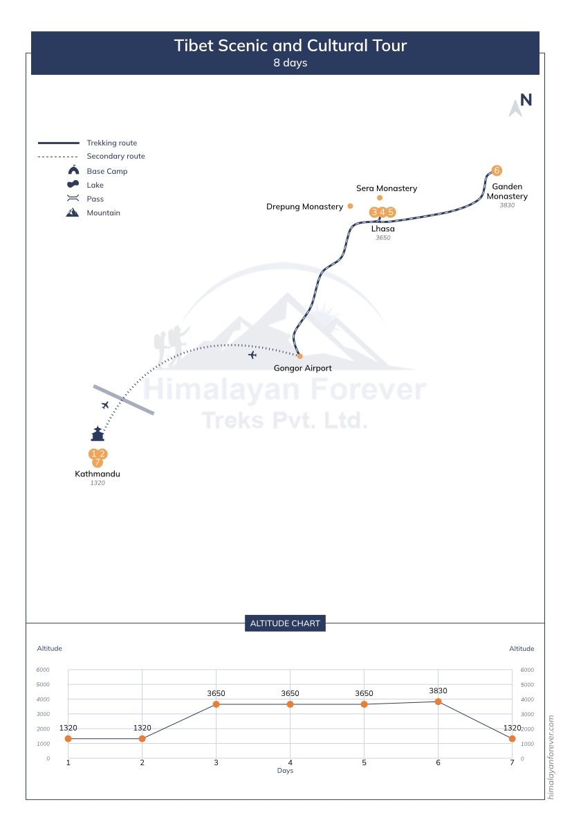 The average elevation within all Tibet is above 3,000 m high, and crossing passes of above 5,000 meters. The highest point on this journey is at 3,830 m on top of a high hill at Ganden Monastery and Lhasa city at 3,650 m high.