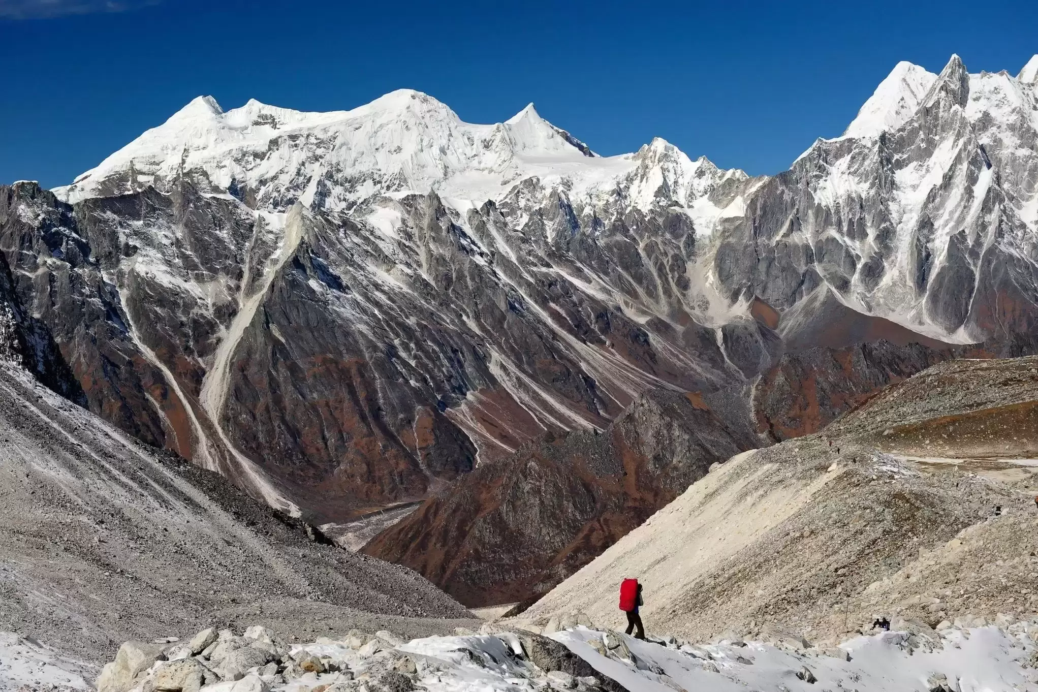 Start the day, early morning having breakfast, and carrying packed lunch for the long hours. From Larke Phedi the path leads to steep climb over moraine of rocks and boulders, following north of Larke glacier. Facing view of Cho Danda and Larke Peak.